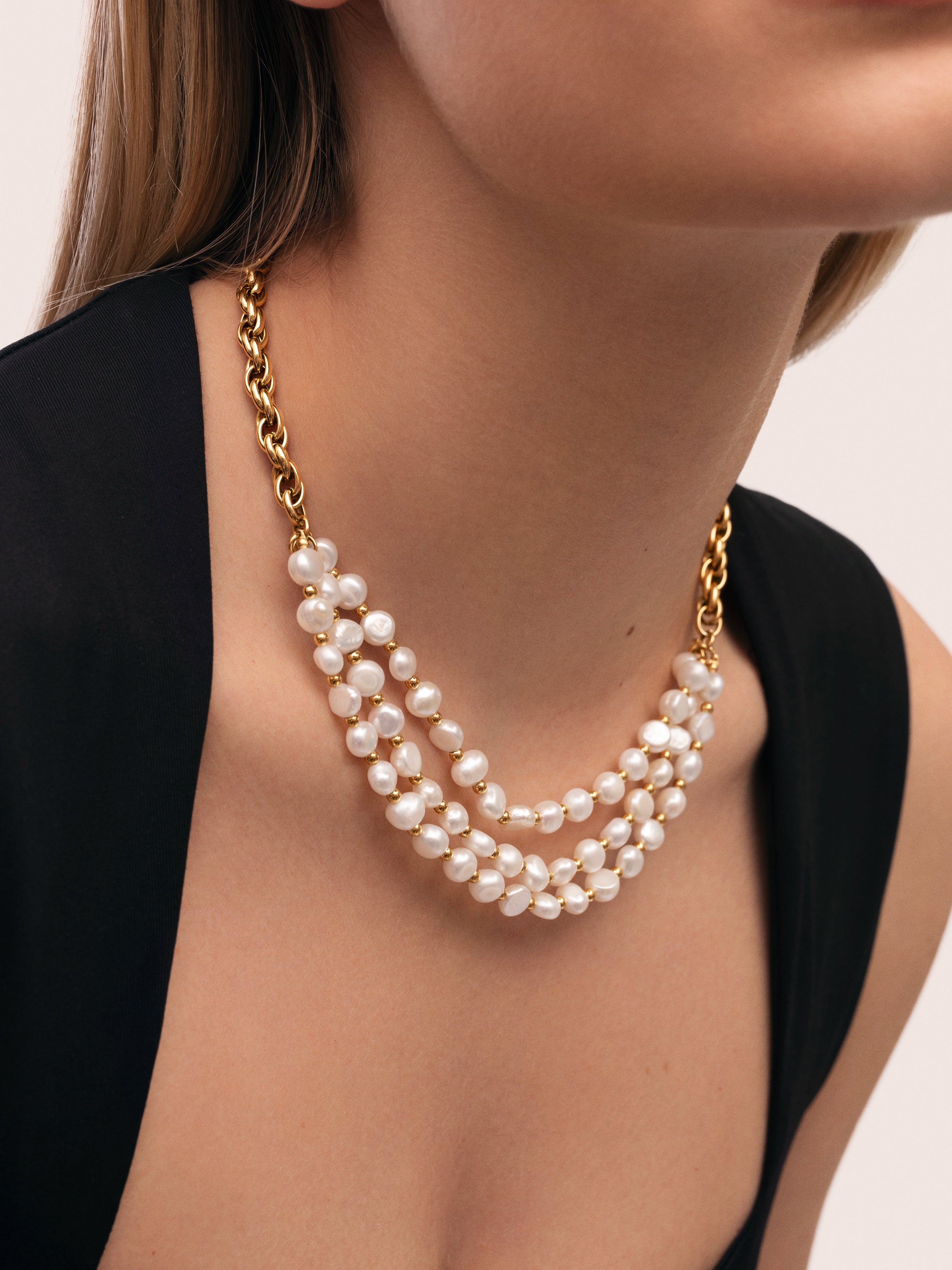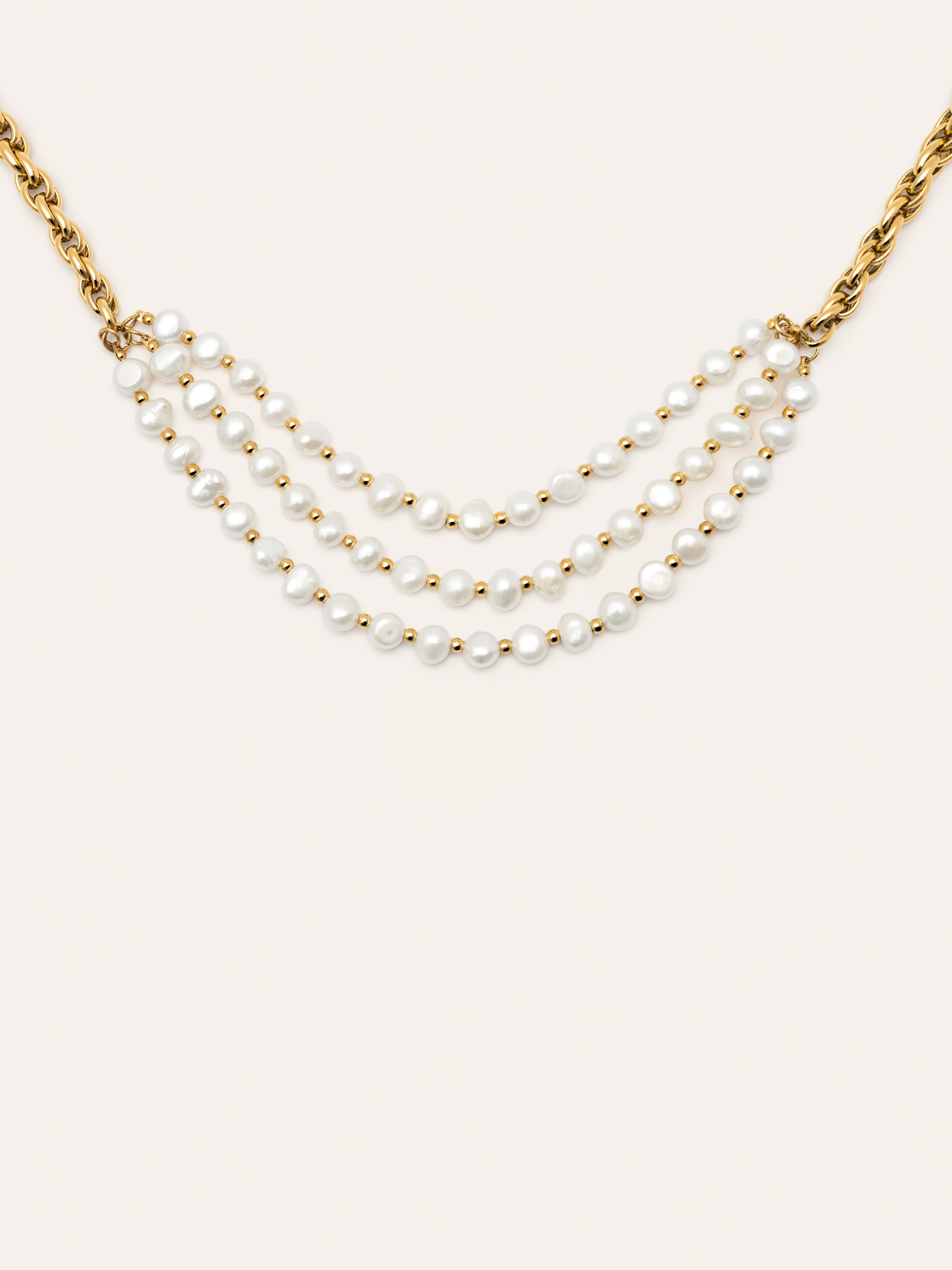 El Collar Audrey Premium es un collar de perlas de tres hileras, con un diseño elegante y clásico. Este collar es una joya maxi y perfecta para un evento especial o un look elegante🤍✨
