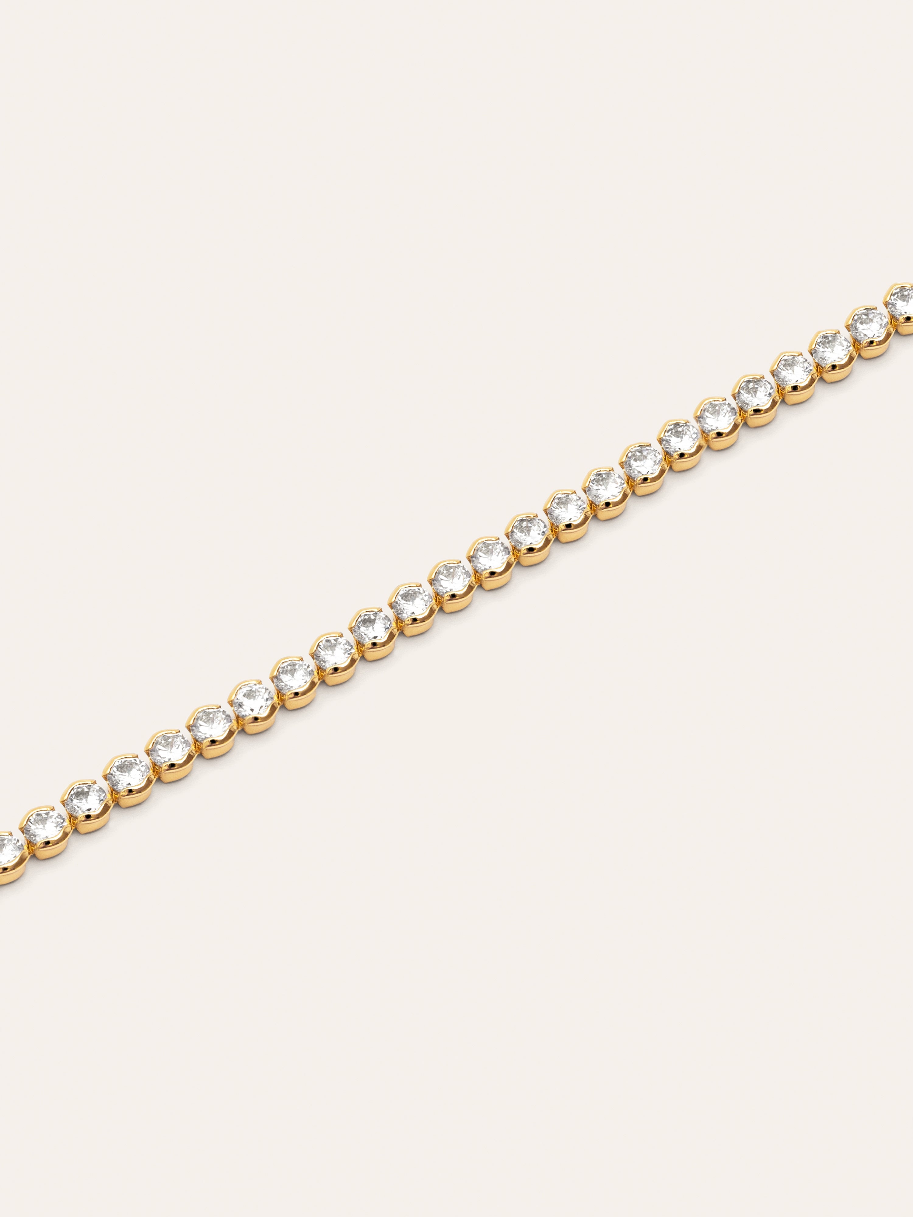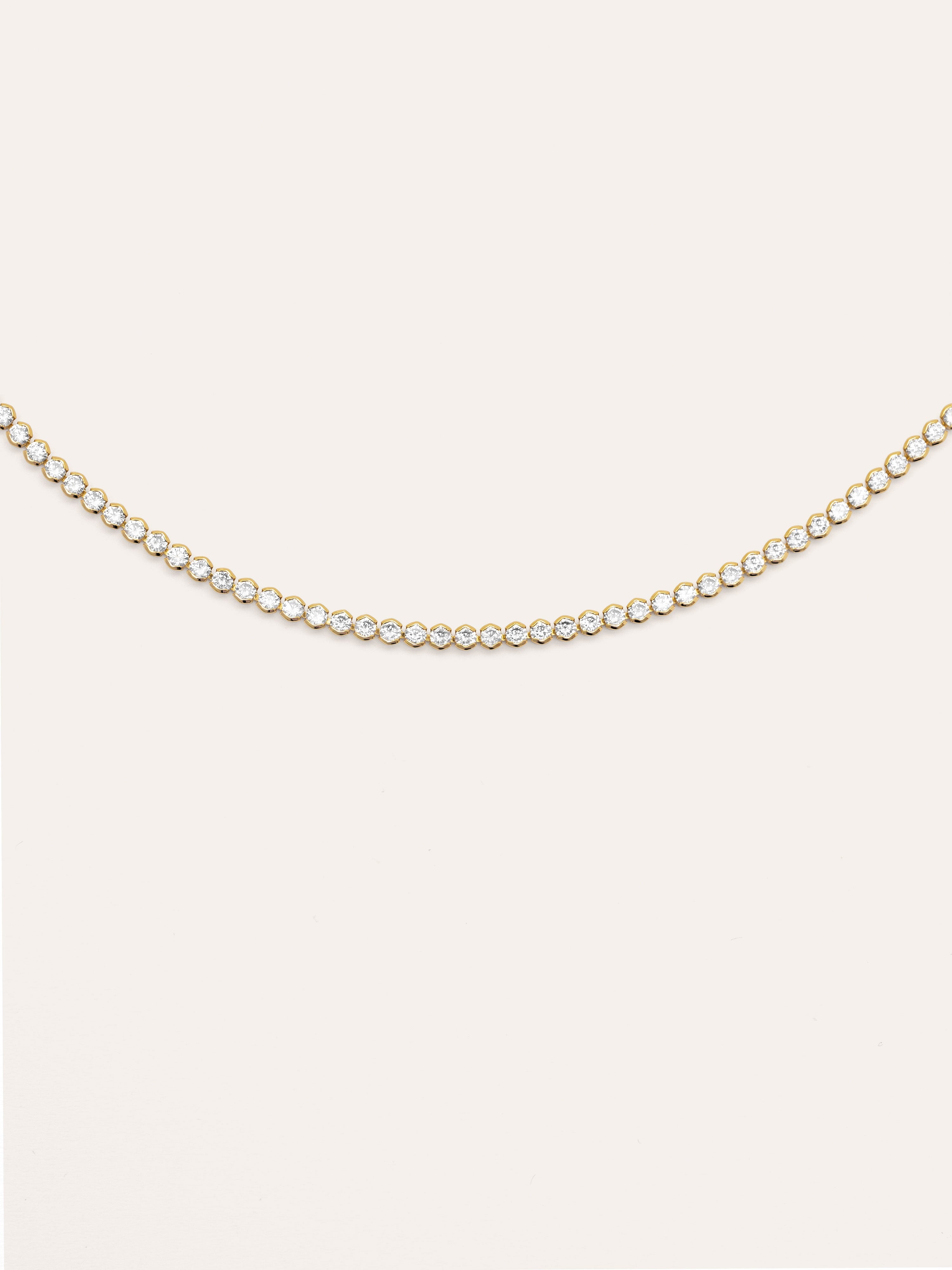 El collar Aurora de estilo riviere es un collar dorado, adornado con una fila de pequeñas piedras brillantes. Te encantará por su diseño, es elegante y sofisticado, ideal para complementar looks más clásicos. ✨