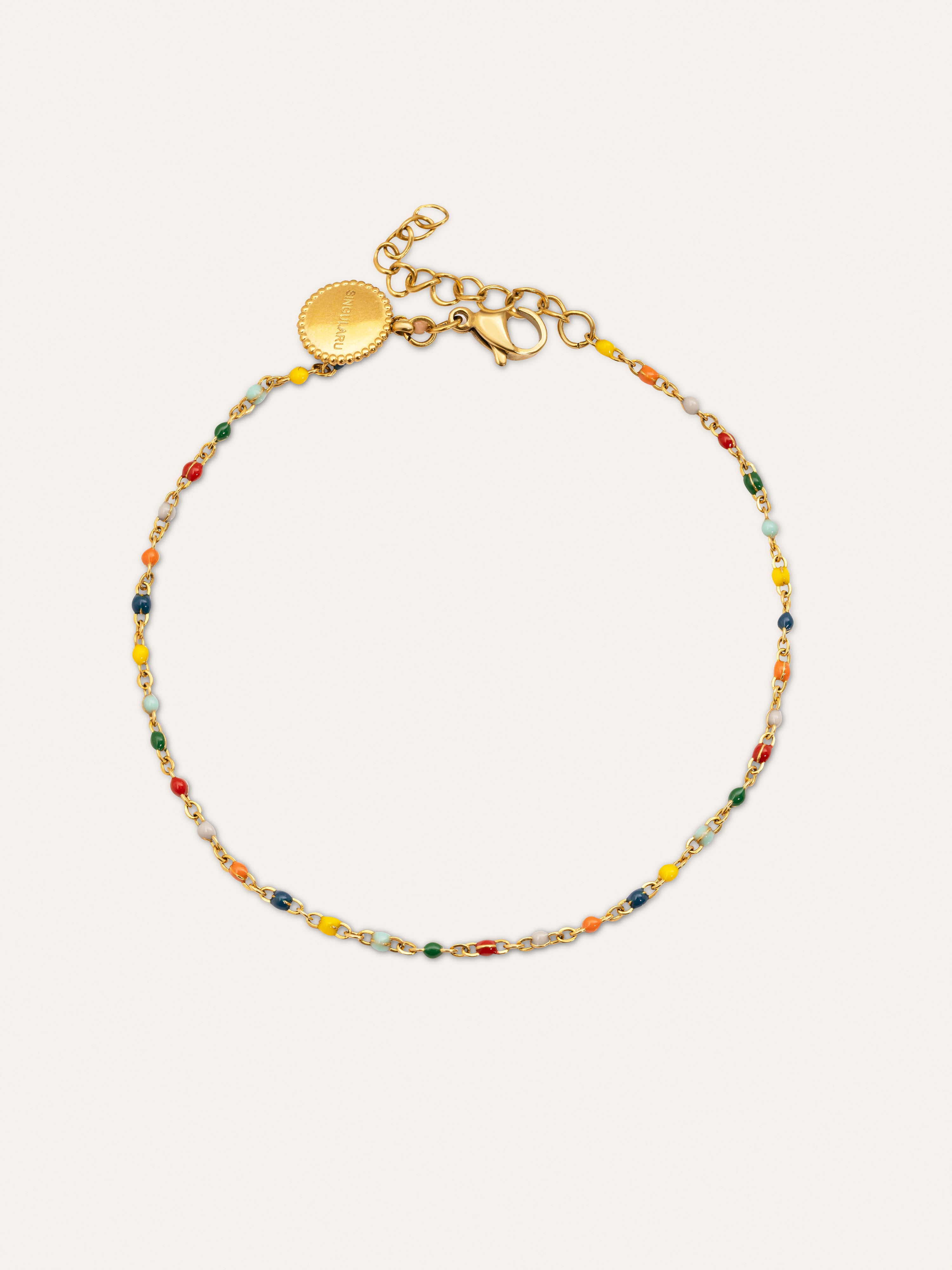 La Tobillera Doble Dots Colors Enamel, con mini dots de colores es perfecta para verano. Una pulsera de pie de acero bañada en oro, resistente al agua y de colores. 🌈