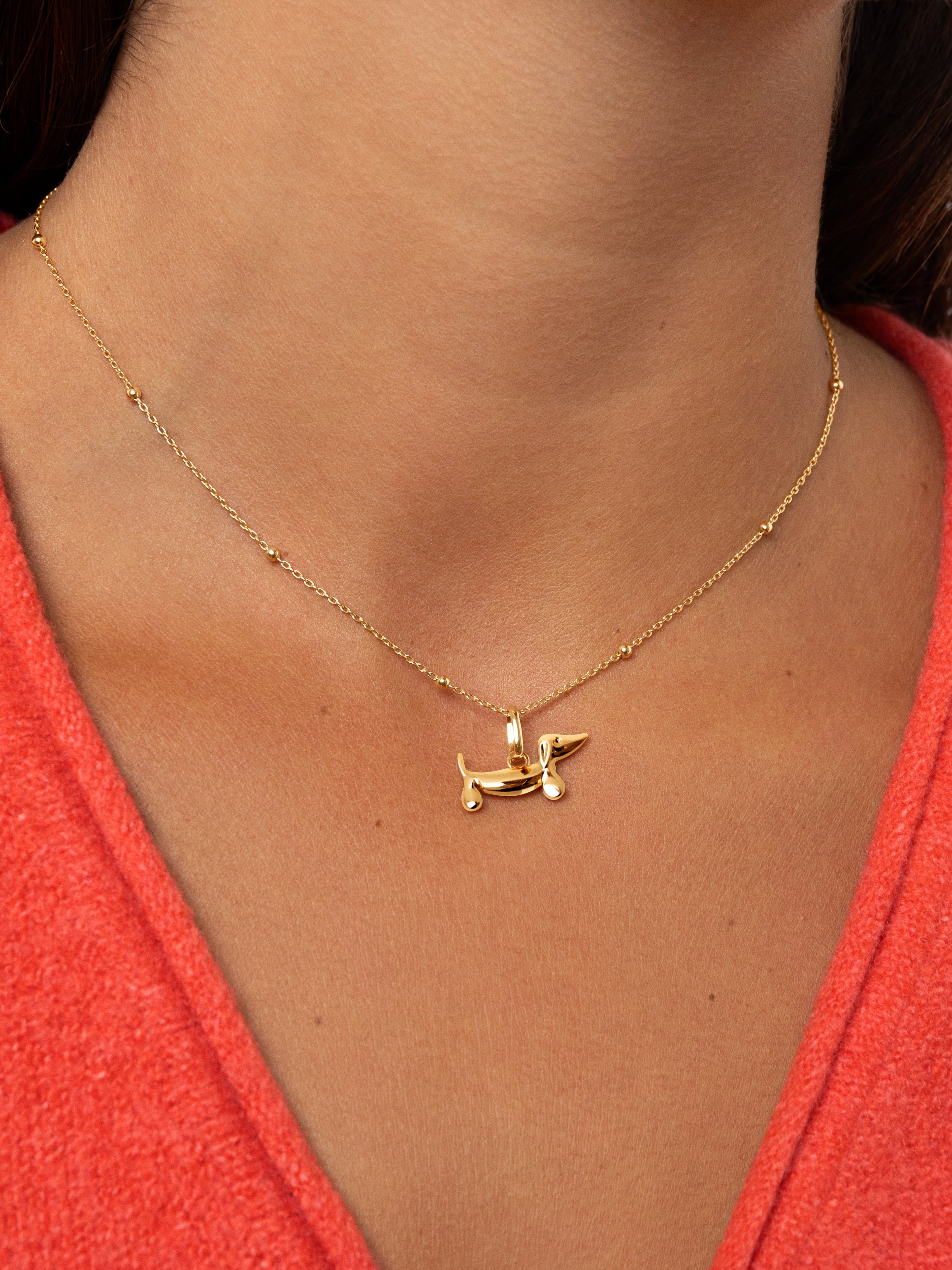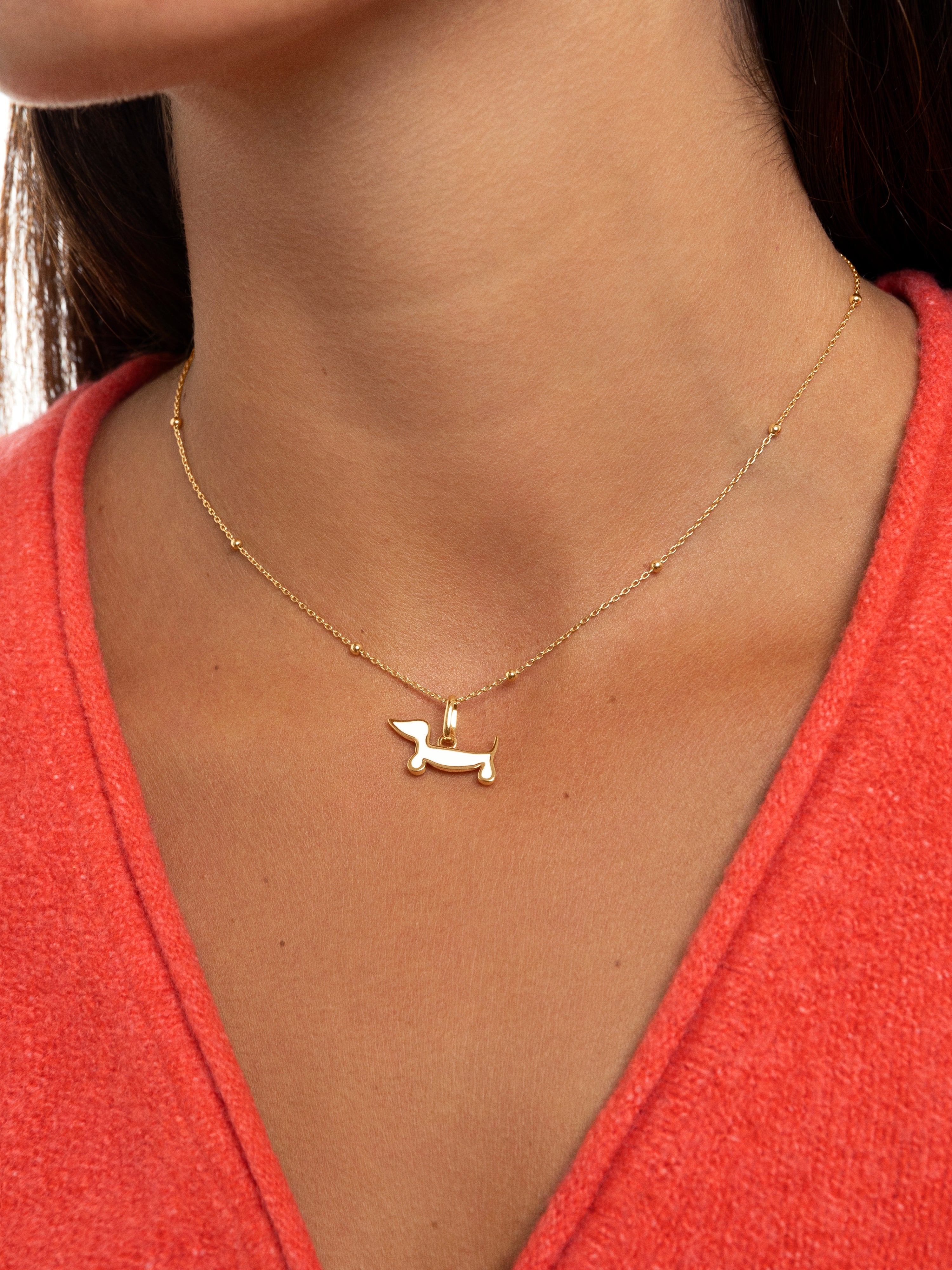 ¡Convierte tu amor por los Teckels en una joya! 🐕 Nuestro charm de perro salchicha bañado en Oro con una cara blanca esmaltada reversible, es el complemento perfecto para añadir a tu cadena de oro favorita. ✨