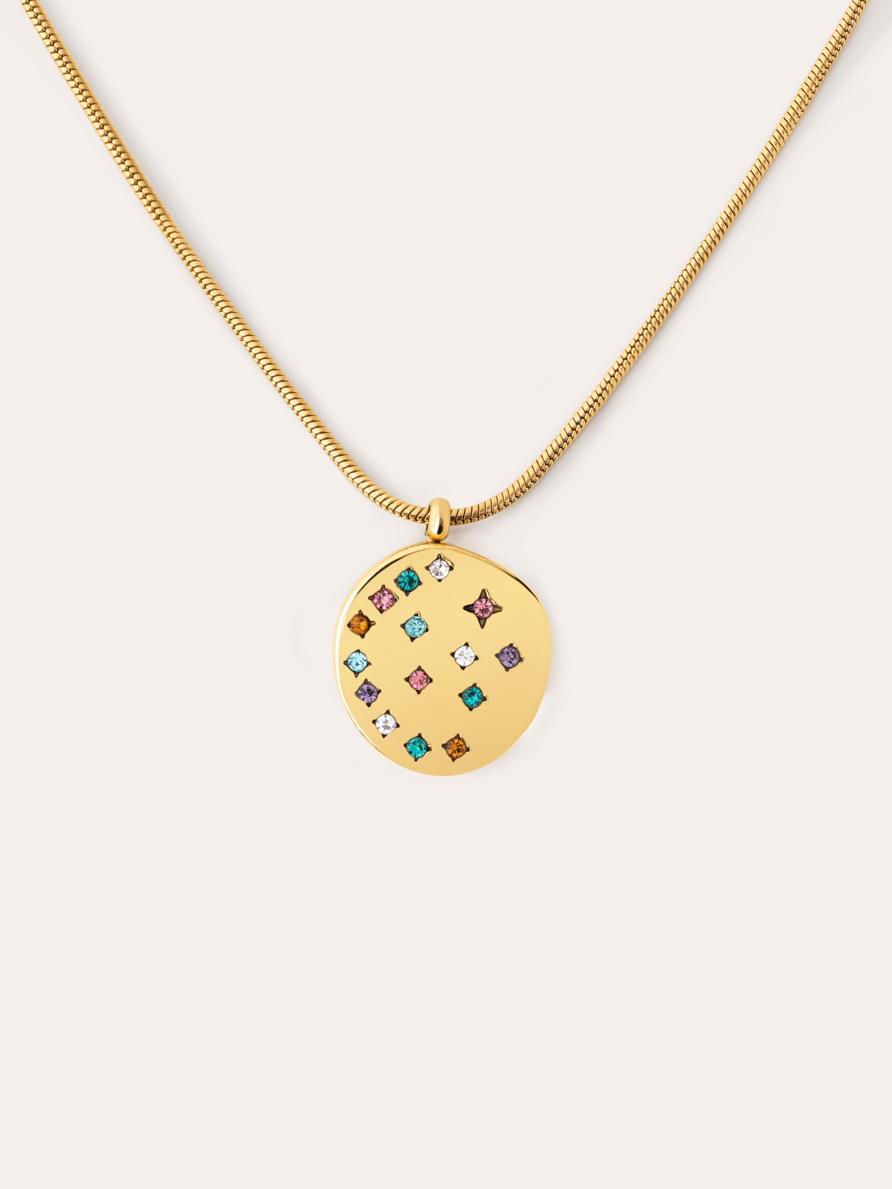 El Collar Bling Rainbow de acero con una cadena y un medallón lleno de circonitas coloridas en forma de estrella es la nueva tendencia. Añade este colgante de acero tu colección de joyas doradas y combina tus mejores outfits con él. ✨