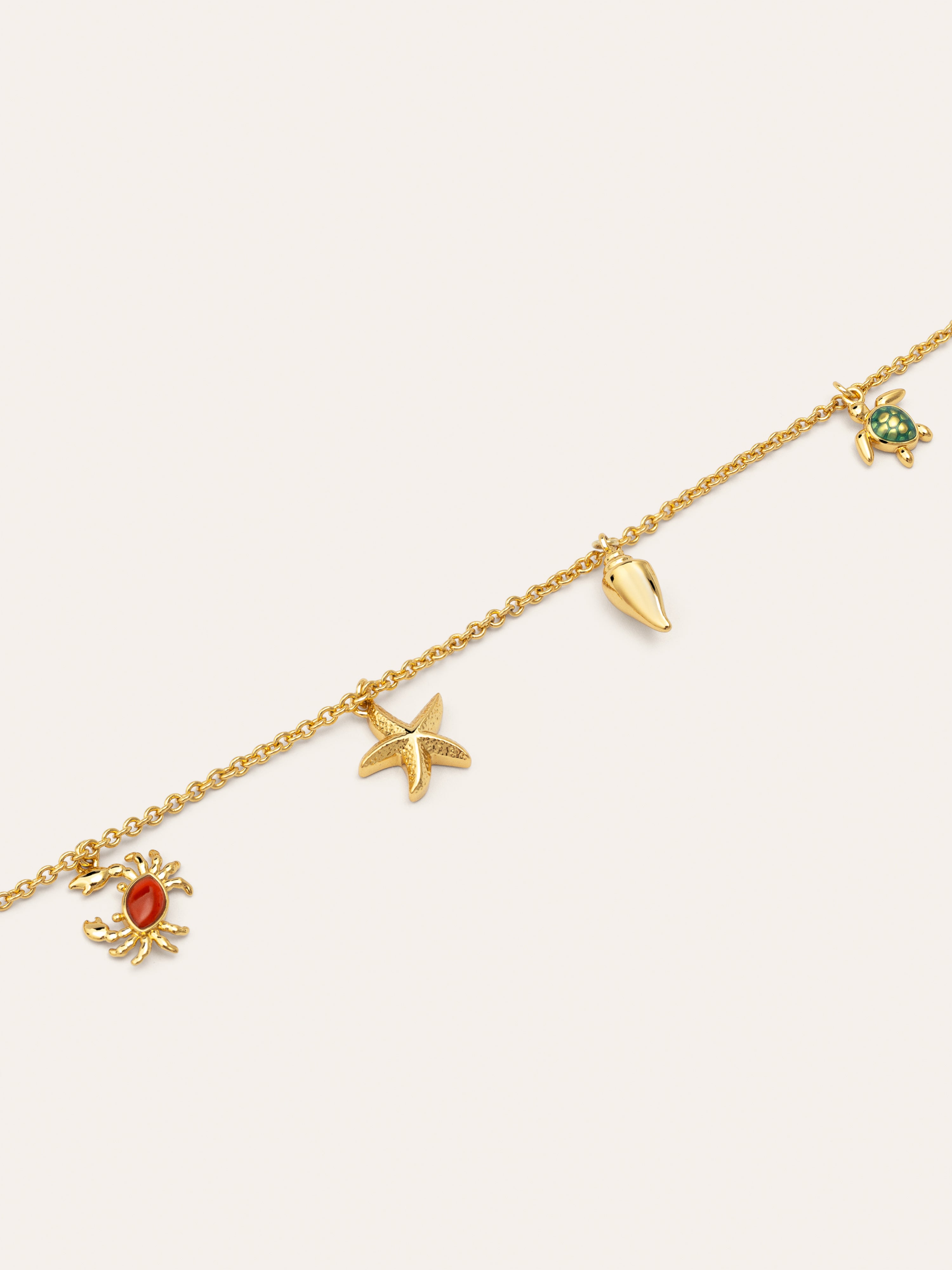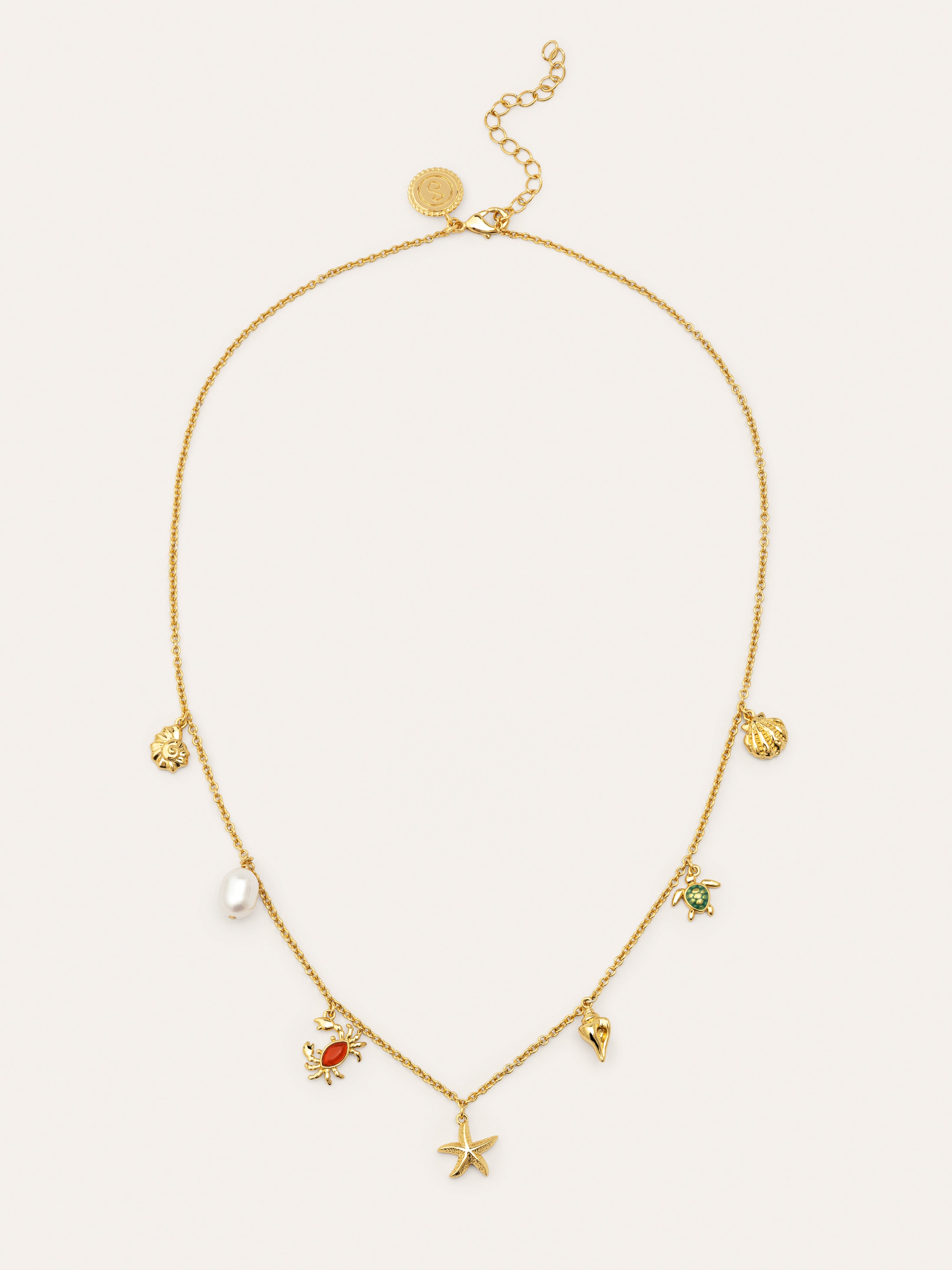 El collar Multicharms Seaside bañado en oro es un collar fino con mini charms colgando super veraniegos. Una tortuguita, una mini estrella, un cangrejito y una perla son los colgantes que te acompañarán este verano. 🐟🌊☀️