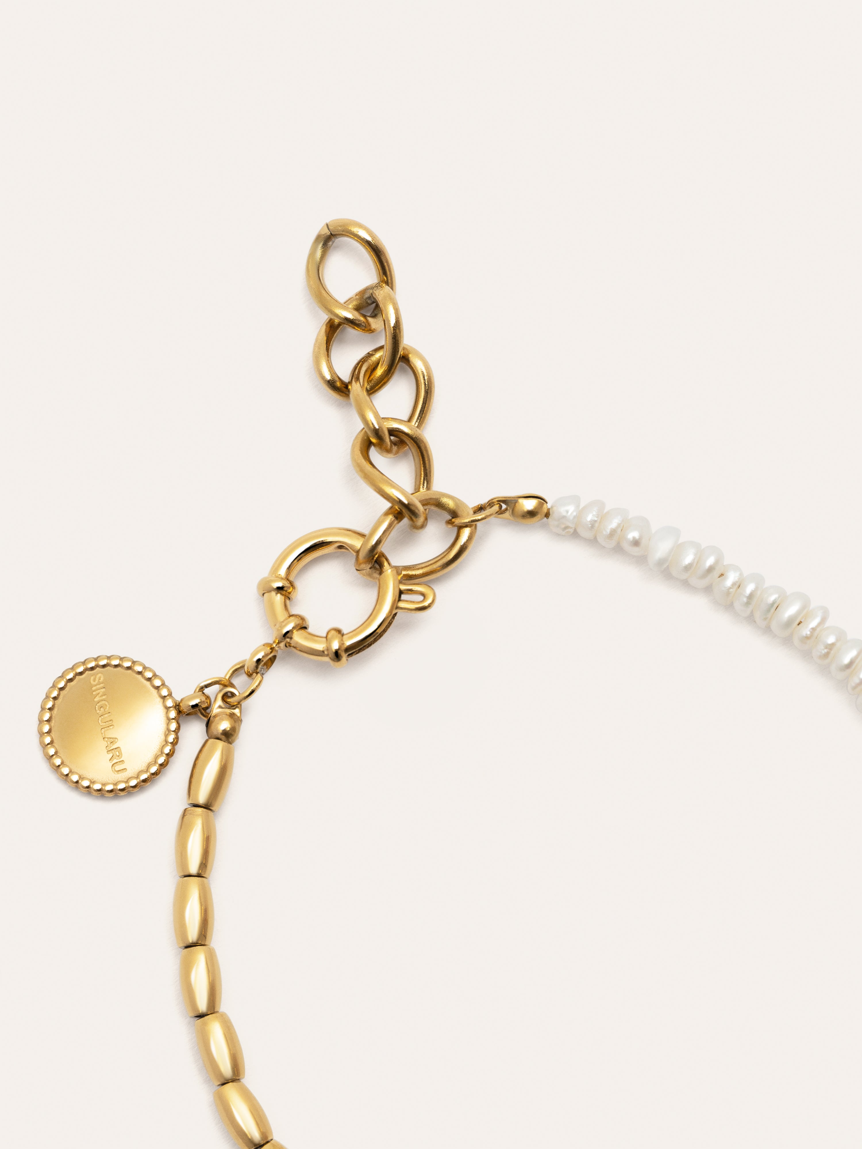 Esta pulsera tiene un diseño asimétrico y moderno, combinando dos estilos diferentes de cadena: una dorada y otra con perlas pequeñas. Es una pulsera perfecta para regalar 🤍![]()