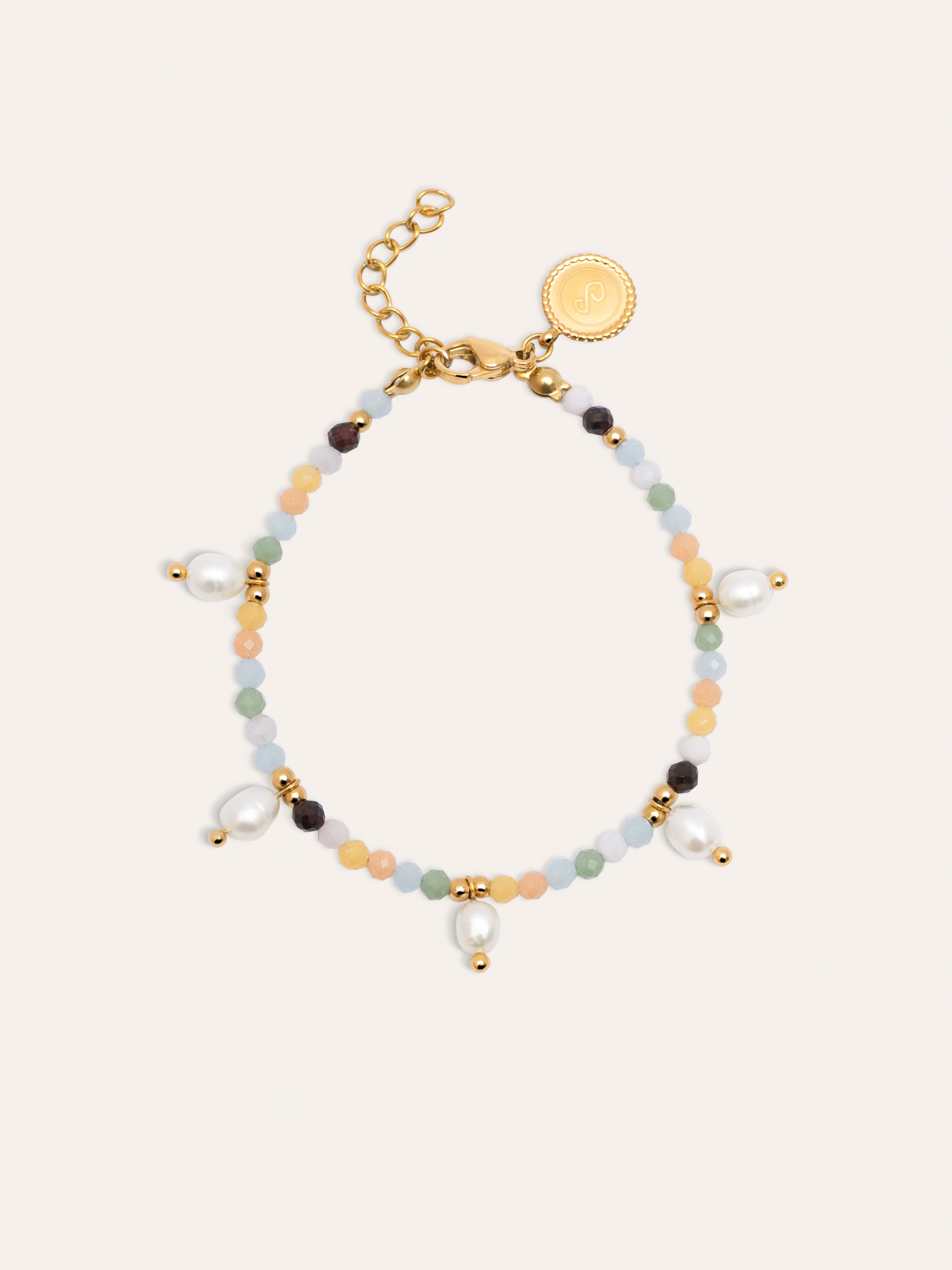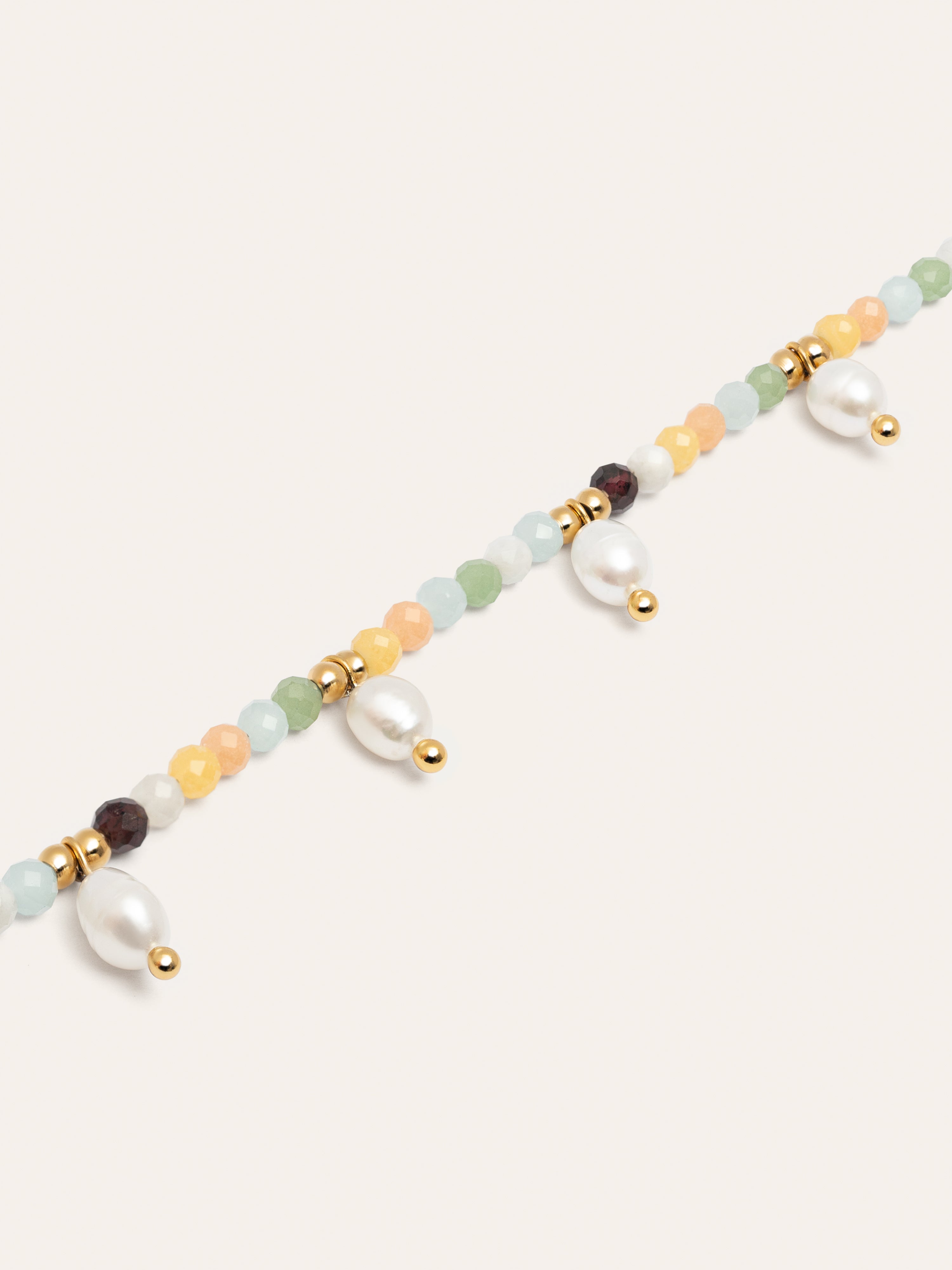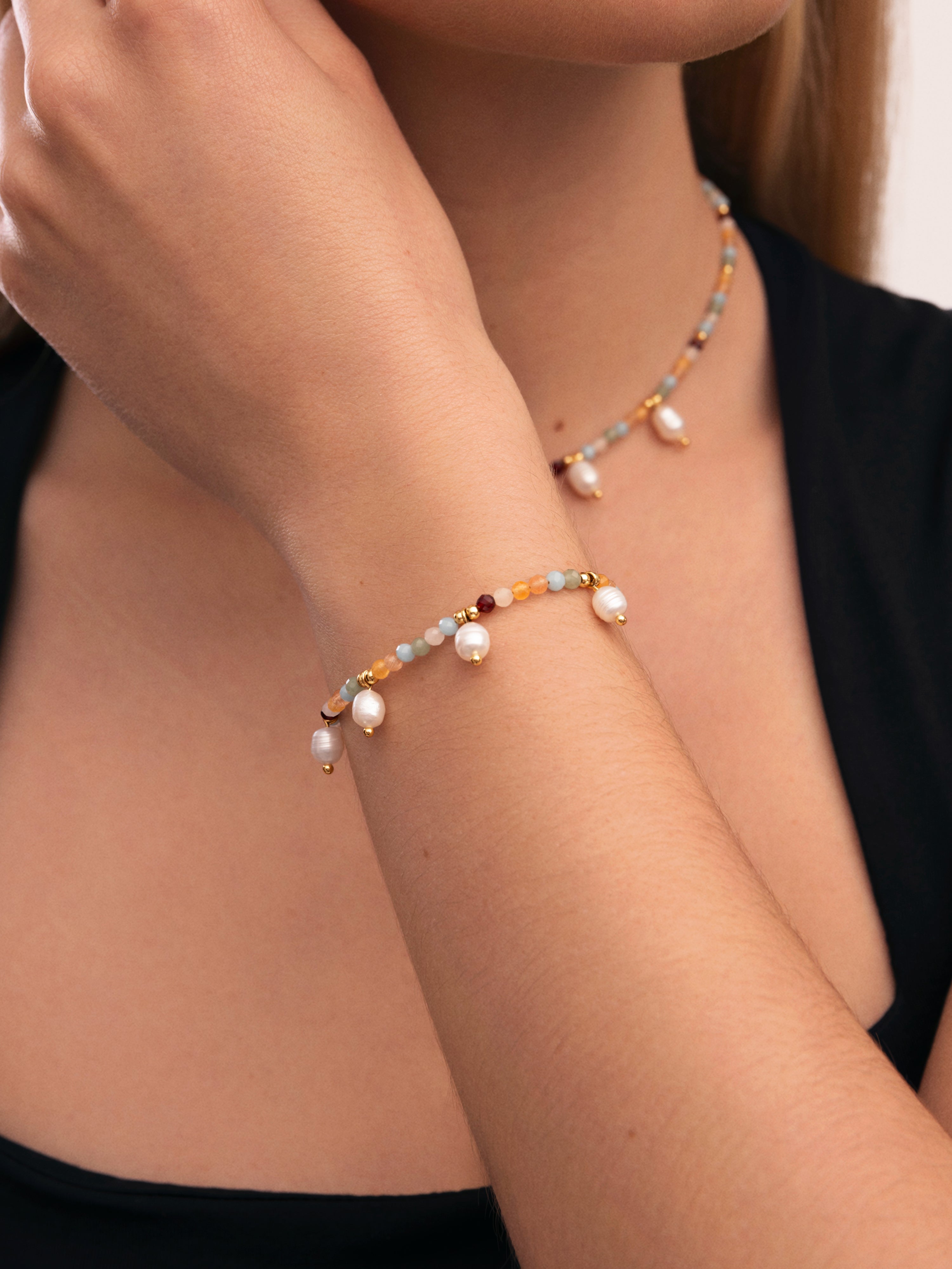 La Pulsera Crystal Perlas llena de mini cristales de colores con perlas irregulares colgando es perfecta para esta temporada. 🌈 Tu joya de acero inoxidable resistente al agua, perfecta para verano 🌊