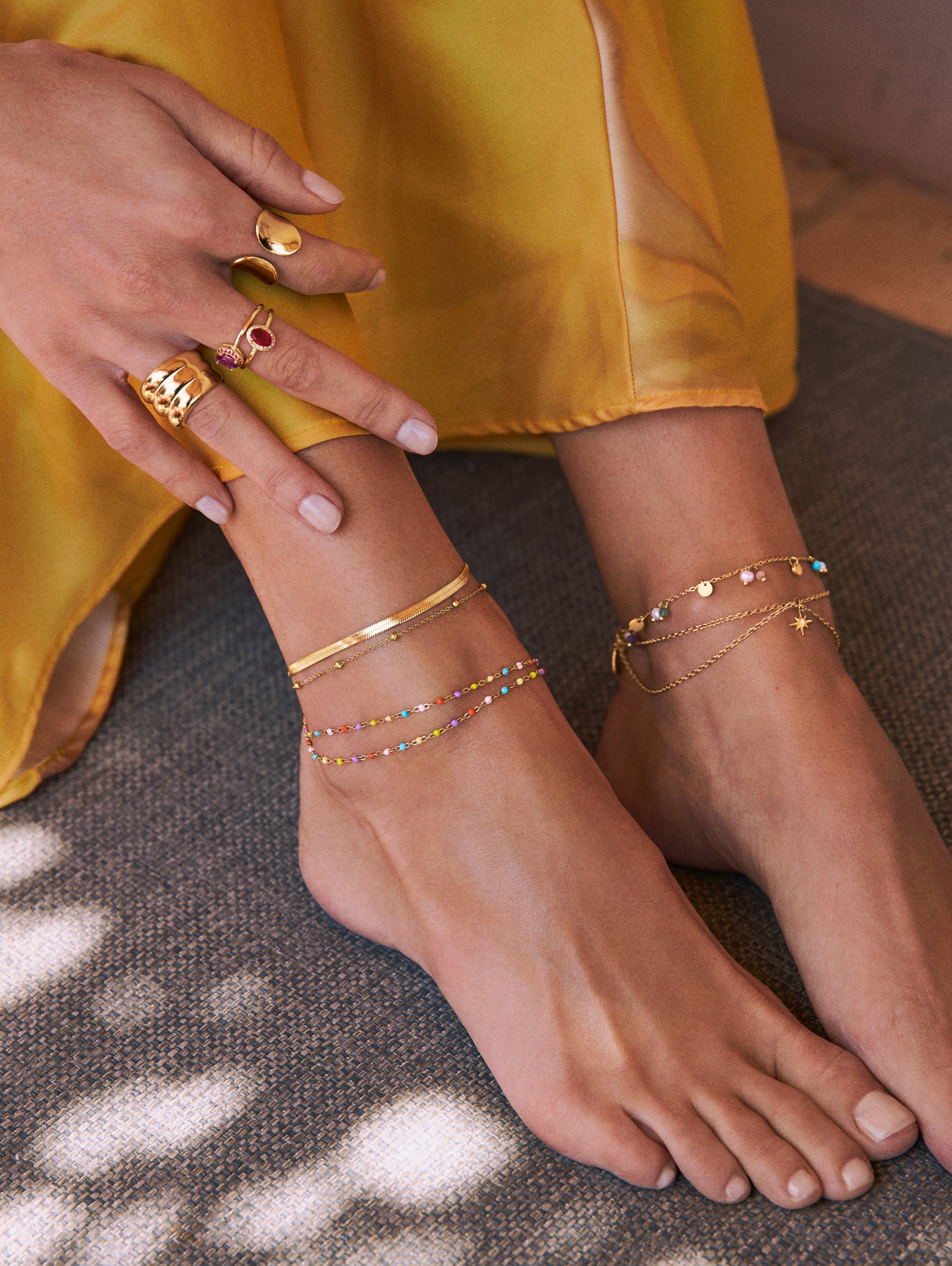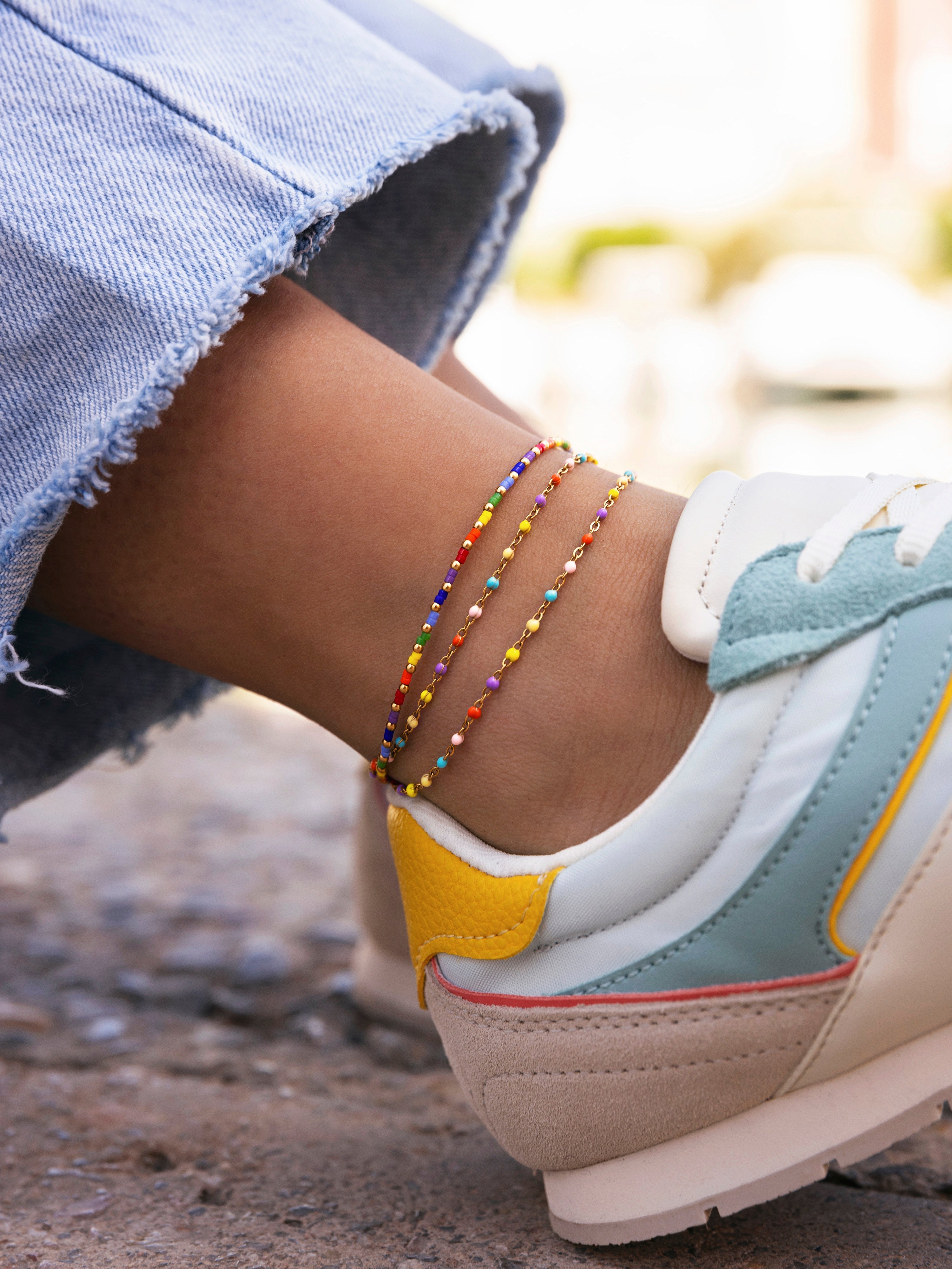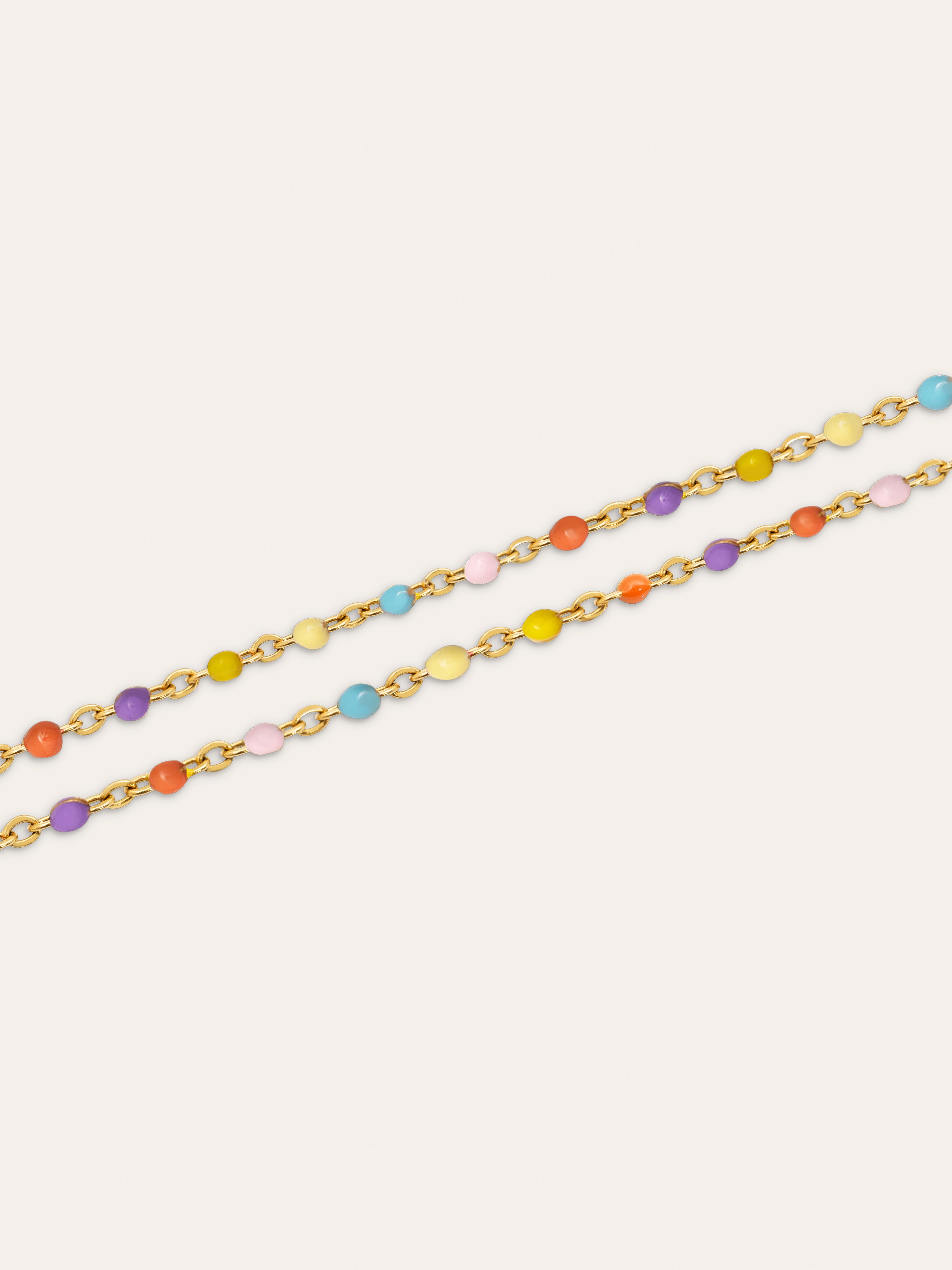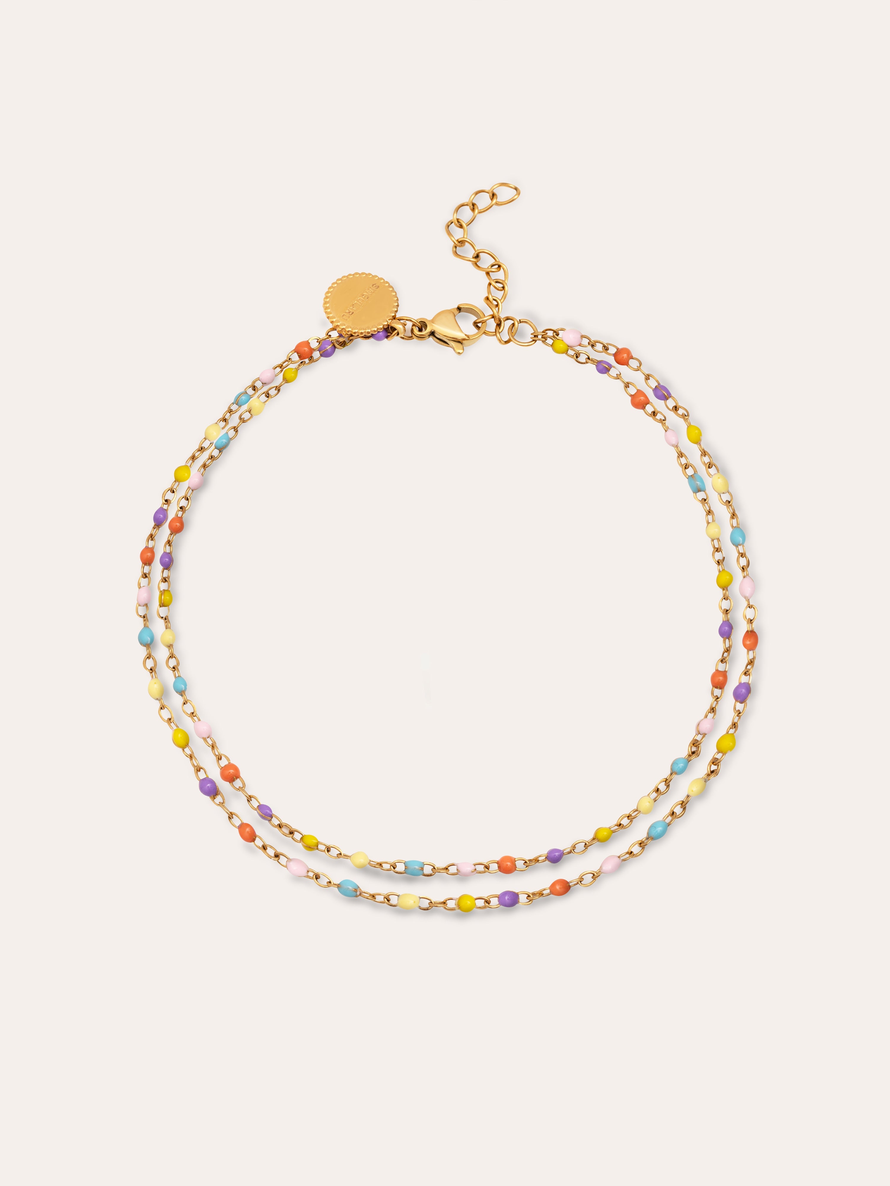 La Tobillera Doble Dots Colors Enamel, con mini dots de colores es perfecta para verano. Una pulsera de pie de acero bañada en oro, resistente al agua y de colores. 🌈