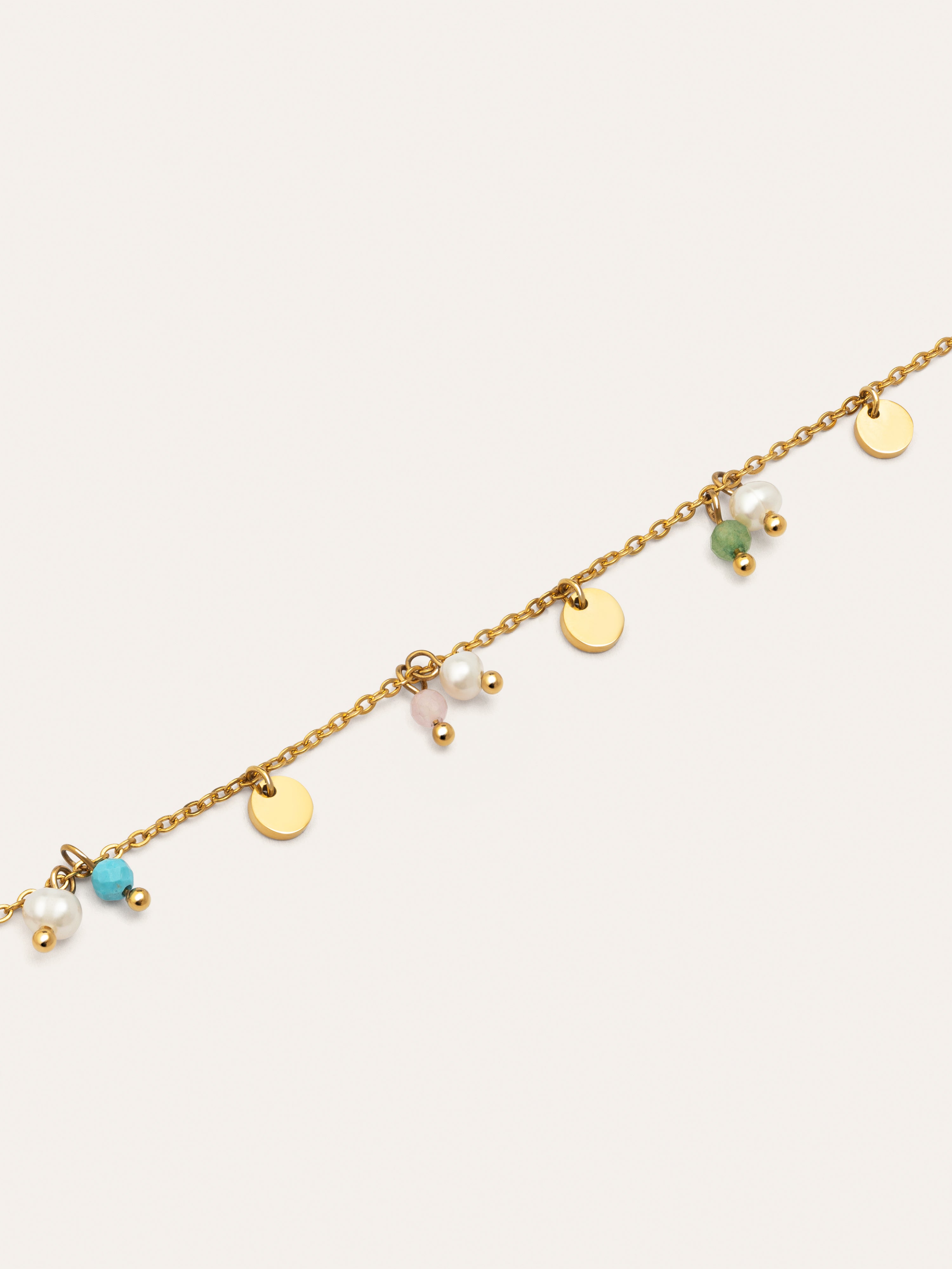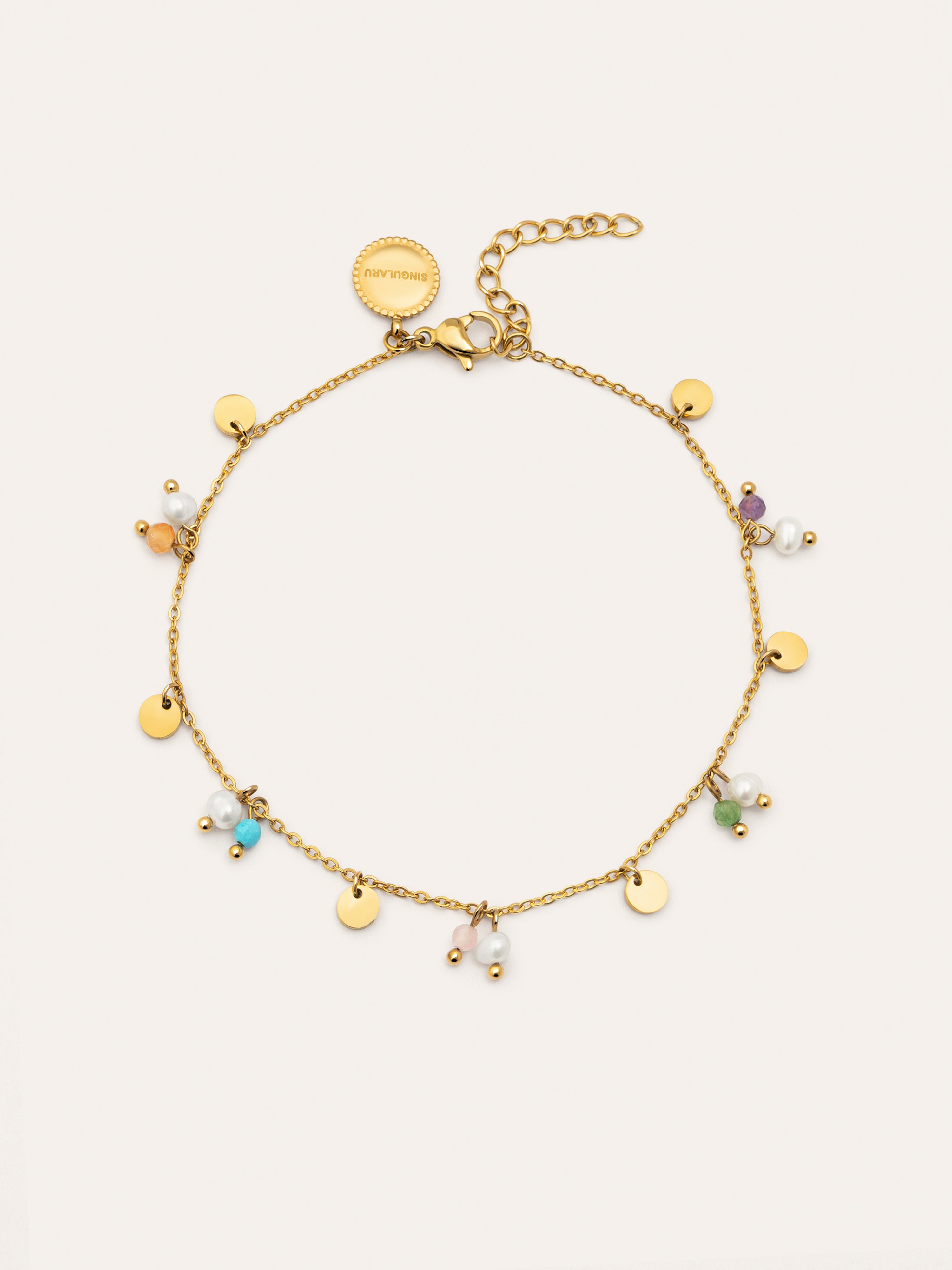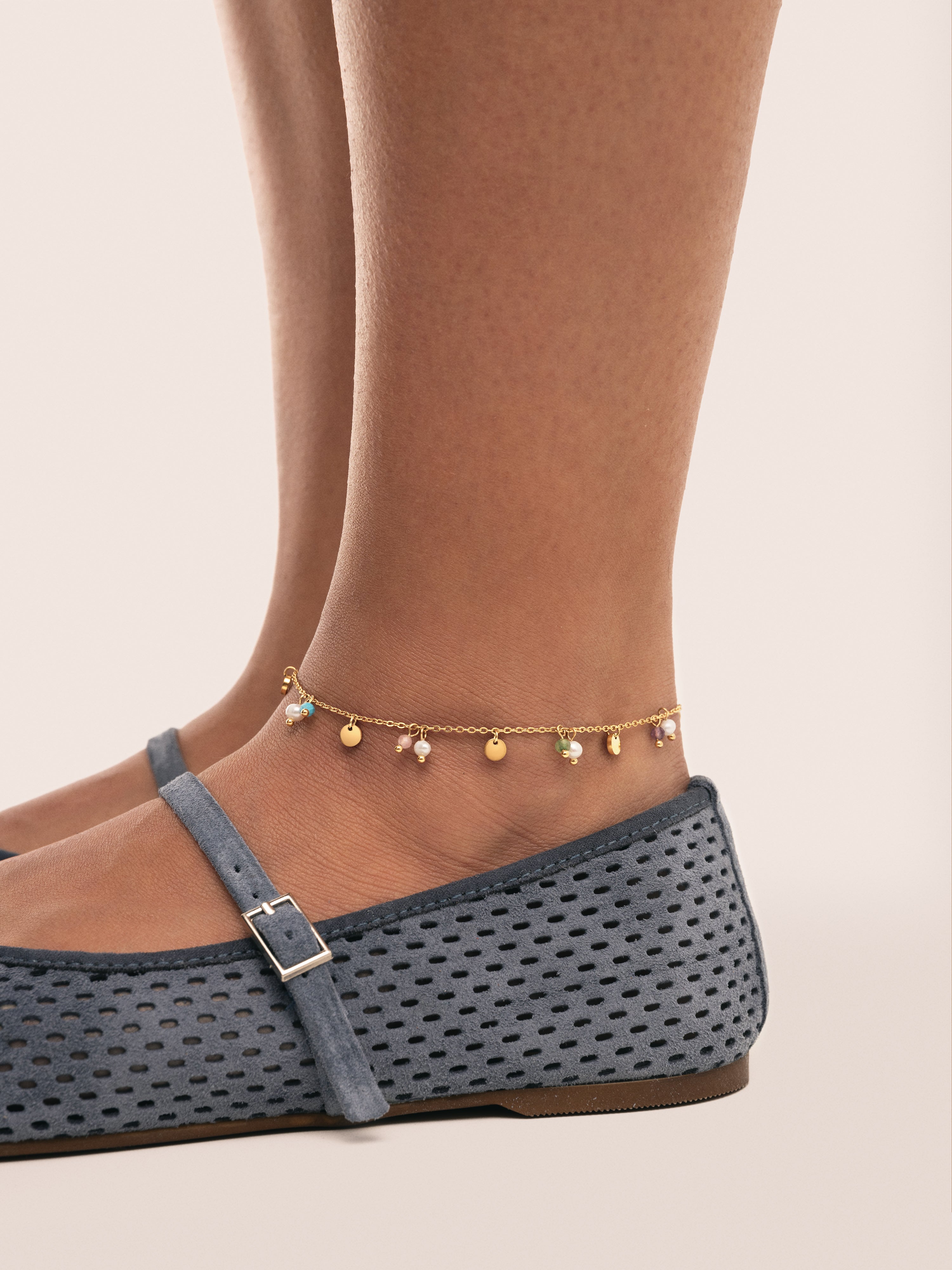 La Tobillera Shamira de acero bañada en oro tiene un estilo boho. ✨ Te encantará por sus chapitas redondas en forma de sol, y sus piedras naturales colgando. 🌈 Esta pulsera de pie resistente al agua es ideal para el verano ☀️